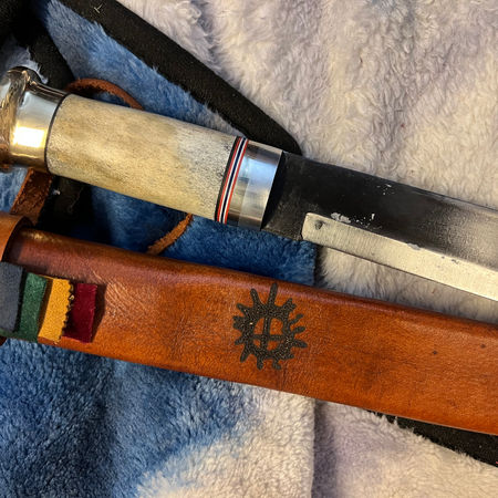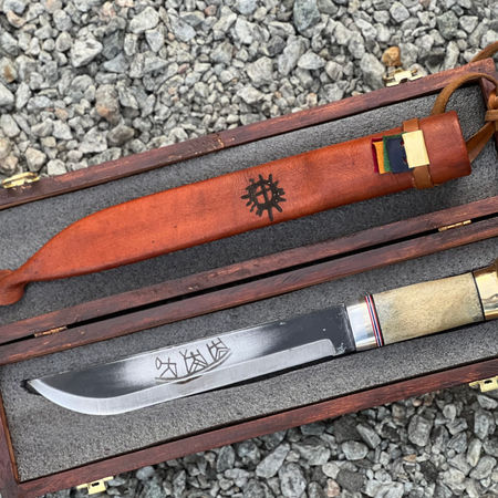 Forged from raw iron ore in the local hills, using the ancient methods of extracting iron ore from mire and iron sands. Handle materials harvested from the local hills from karelian birch logs. Guard sleeves and caps cast from local copper. This is the ultimate knife. This knife is made in the stone age tradition, purified through modern means. The original knife was originally made for a local shaman but I make a limited edition of knives for collectors. Each knife is numbered and signed as part of the limited stock. USD 5000 / NOK 50 000 for Your individual edition knife. The Shaman knife comes in a hand made sheet made from local Elk and moose.
